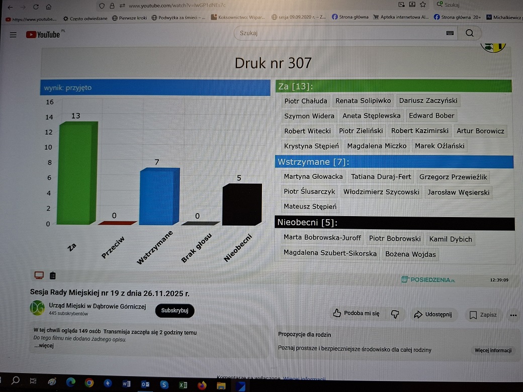 Uchwała została oczywiście przyjęta, wynik głosowania obok, ale chciałbym zwrócić uwagę na to, że nagle próbuje się utrzymać tę spółkę przy życiu, gdy te działania są wg mnie bardzo spóźnione i wadliwe. Przecież nawet na nieudane łączenie jej z FPŻ sp. z o.o. wydano pieniądze, które pochodzą z budżetu wszystkich mieszkańców. Ci rządzący Dąbrową Górniczą mają to za nic!
