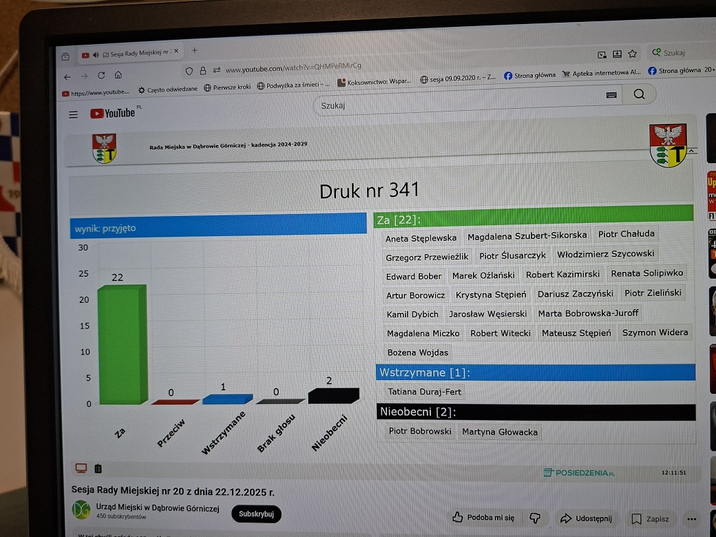 Mnie nie dziwi, że spółka FPŻ Sp. z o.o. nie ma przez te lata paradziałalności pieniędzy na nic. Niestety jej działania z wielkimi patopolitykami w Radzie Nadzorczej były tylko dołujące. Radni zagłosowali gremialnie oczywiście za uchwałą (foto głosowania powyżej). Zastanowiło mnie, wręcz uderzyło, że na sesji w dniu 22.12.2025 r. nie przeprowadzono najmniejszej dyskusji nad stanem finansów czy tp. spółki Fabryka Pełna Życia Sp. z o.o.! Ciekawe, jakie dostali tym razem gadżety od FPŻ Sp. z o.o.?