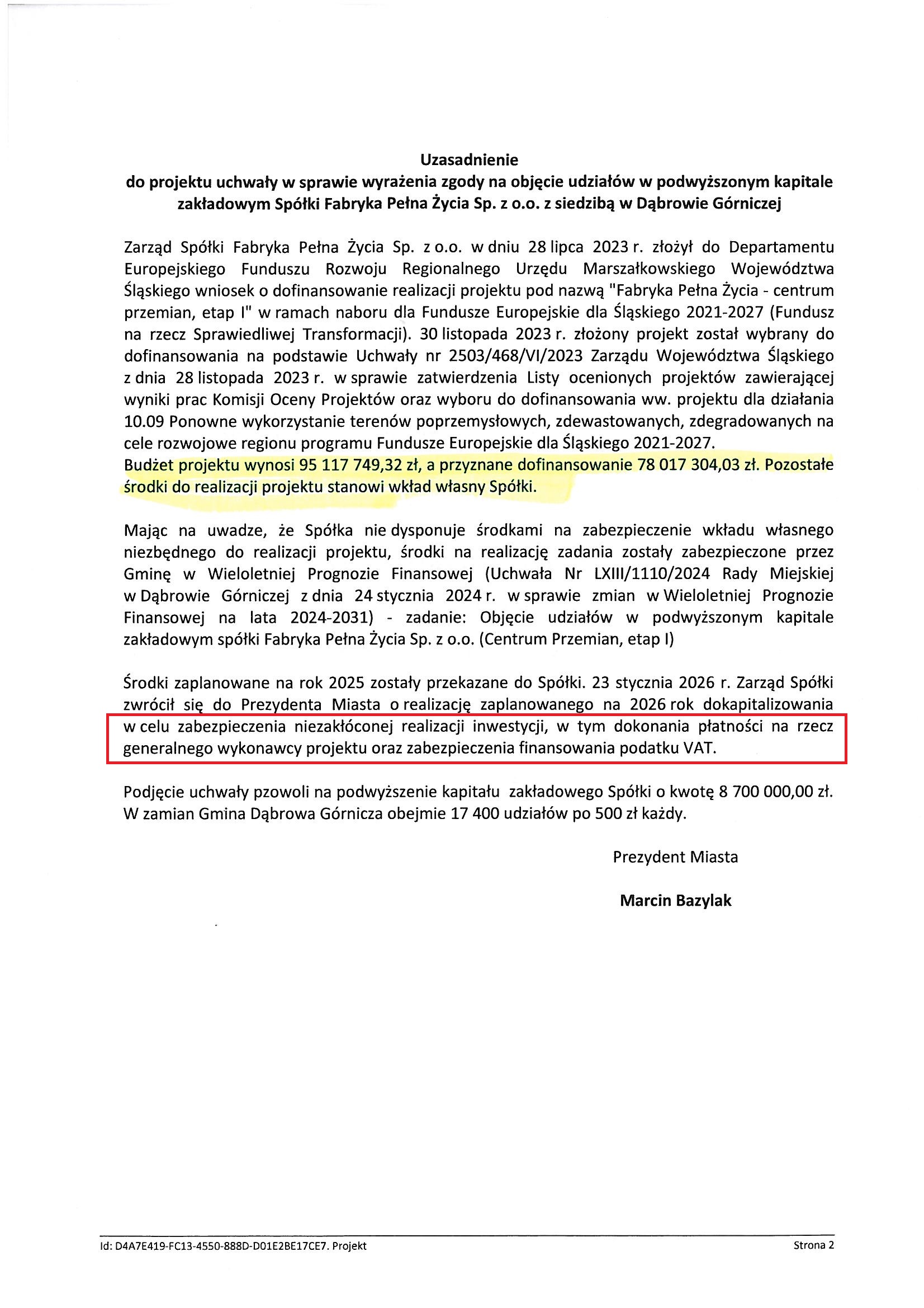 „Środki te są niezbędne do uzupełnienia kapitałów własnych spółki w celu pokrycia luki płynności, powstałej w wyniku nałożenia przez instytucję zarządzającą korekty finansowej (kary) w łącznej wysokości 14 mln zł za naruszenie art. 56 ustawy pzp, czyli konflikt interesów, zgodnie z ostateczną informacją protokolarną z dnia 15 stycznia 2026 r.„.