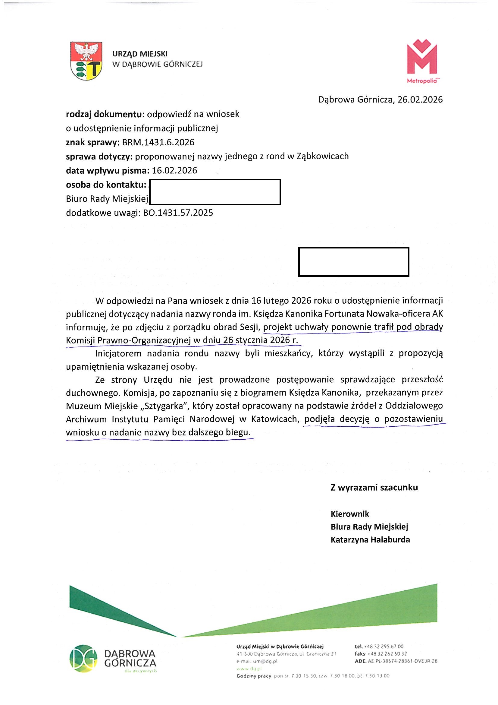 Chciałbym wyjaśnić jeszcze Szanownym Mieszkańcom, co z nazwą ronda na skrzyżowaniu ulicy Armii Krajowej i łącznicy do drogi S1 w Dąbrowie Górniczej (Ząbkowicach). Szczęśliwie na sesji Rady Miejskiej Dąbrowy Górniczej w dniu 22.12.2025 r. zdjęto projekt uchwały z propozycją jego nazwy, tj. Ks. kan. F. Nowaka oficera AK. Przyczyną były wtedy wątpliwości związane z tym czy rzeczywiście ksiądz był oficerem AK, ze względu na młody wiek, ale była też podniesiona przeze mnie (jeszcze przed sesją) druga strona medalu, czyli jego współpraca z komunistycznymi organami bezpieczeństwa w okresie PRL-u! Zobacz: Rondo im. Ks. kan. F. Nowaka?!.